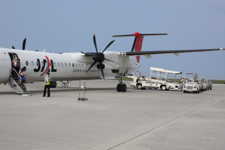 JALで出発です♪ なんだか小さな飛行機 げんくんの荷物置き場は