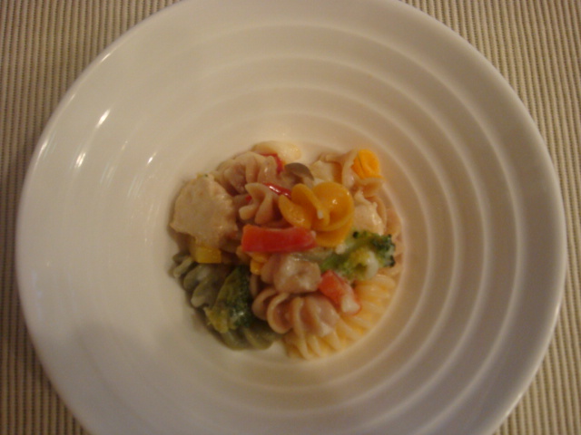 パスタも加えて炒めて器に盛ります。ホワイトソースをかけて最後に