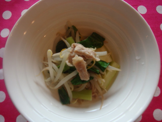 材料 3わん分 もやし(1パック) 小松菜 60g セロリ60g 無塩バター5g