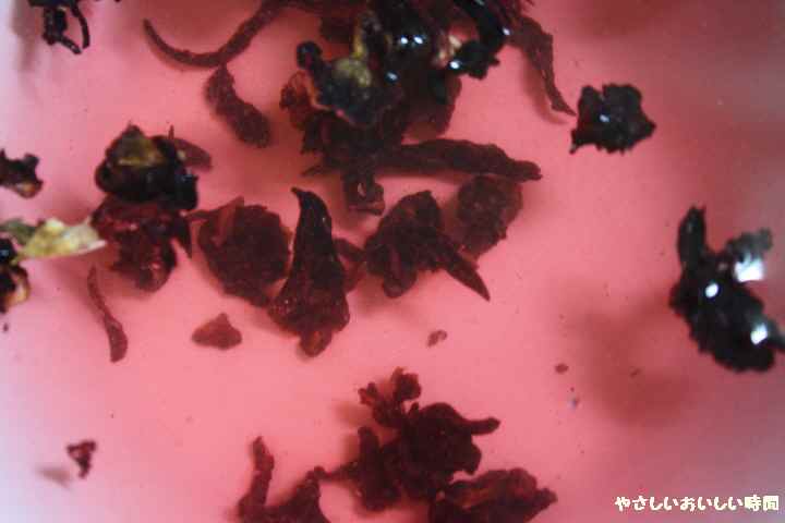 水を注ぎハイビスカスを浮かべて↓の写真のように色着くまでおきます