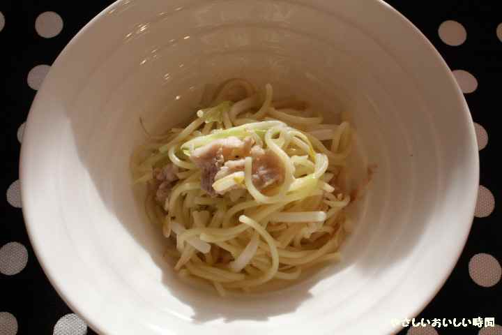 焼きそばの麺 一玉 もやし50g キャベツ50g 豚肉50g アミエビ少々