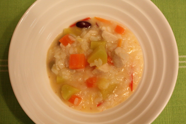 お鍋に適量の水を入れ材料を加えて煮込みます。さらにごはん、スキムミルクを