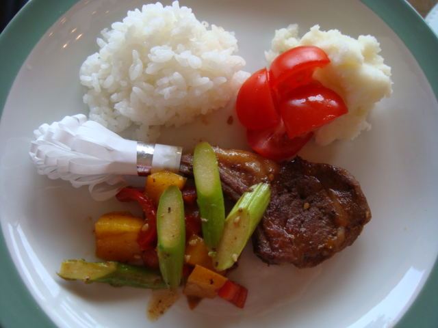 あとはお肉 ごはん ポテトをお皿に盛りつけて