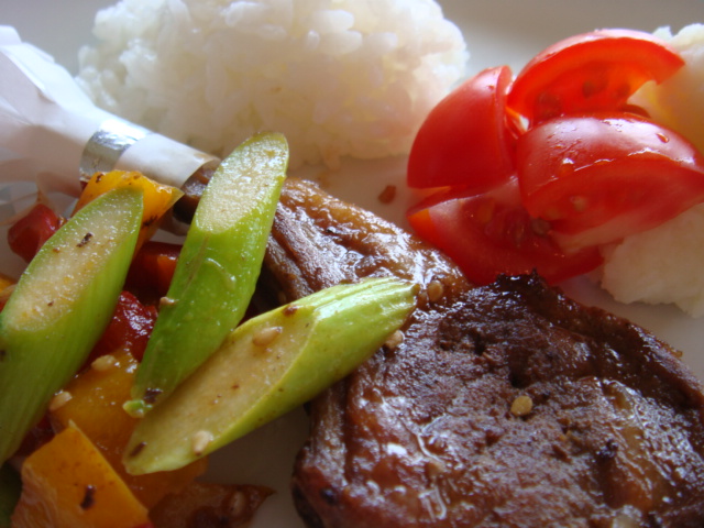 材料は 子羊 アスパラ パプリカ赤黄 にんにく