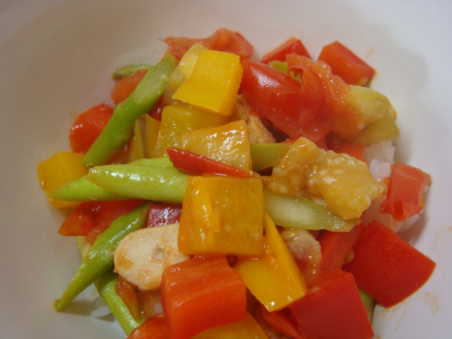 材料はパプリカ(赤黄) アスパラ 鳥ささみ